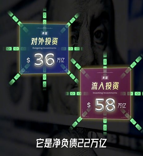 其实美国整个国家每年的对外投资,就是投资别人的,有 36 万亿美元,而别人投进来的有 58 万亿。虽然这俩一减它是净负债 22 万亿,但是它对海外投资这部分其实大部分都集中在更长期的发展中国家的高风险的债券投资,这些投资的平均收益率、票面利率通常会更高。