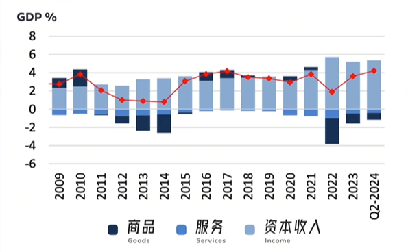 而反过来投资进美国的钱,一方面美国它在加息之前,这个债券的票面利率其实是很低的,更主要的是这很多投资都是美国的股票,而股票投资只有分红是被算在这个经常账户里的,这个收益率其实就非常低了。